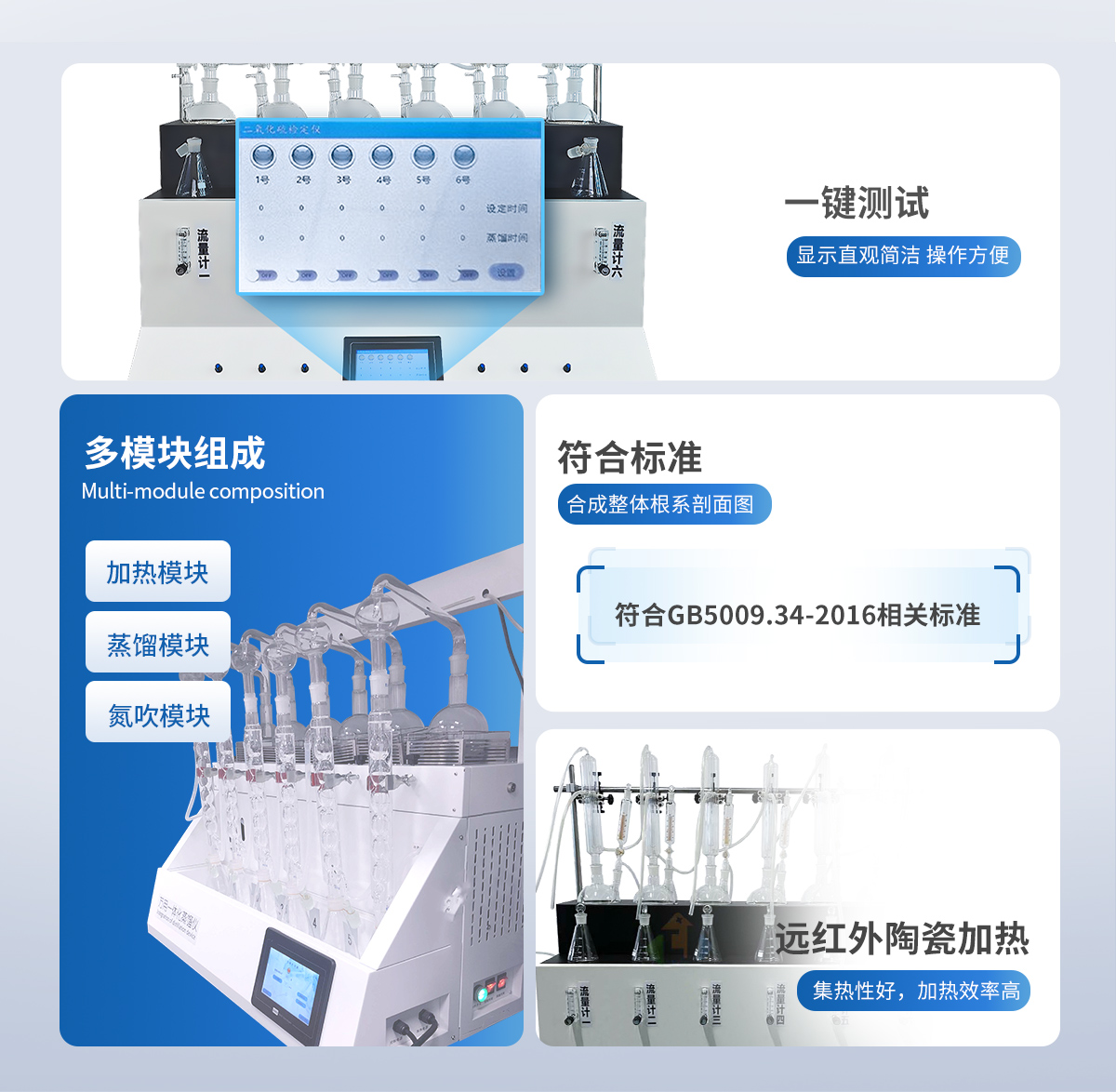 中藥二氧化硫殘留量測定儀主要由加熱模塊,蒸餾模塊,氮吹模塊組成。加熱模塊設(shè)置了高,中,低三檔加熱速率控制功能,可實現(xiàn)加熱效率的**控制面板;蒸餾模塊選用高硼硅材料,耐熱性好,堅固耐用;。氮吹模塊可外接氮氣發(fā)生器或氮氣鋼瓶,并配有高精度氣體流量計,嚴格控制氮吹速率