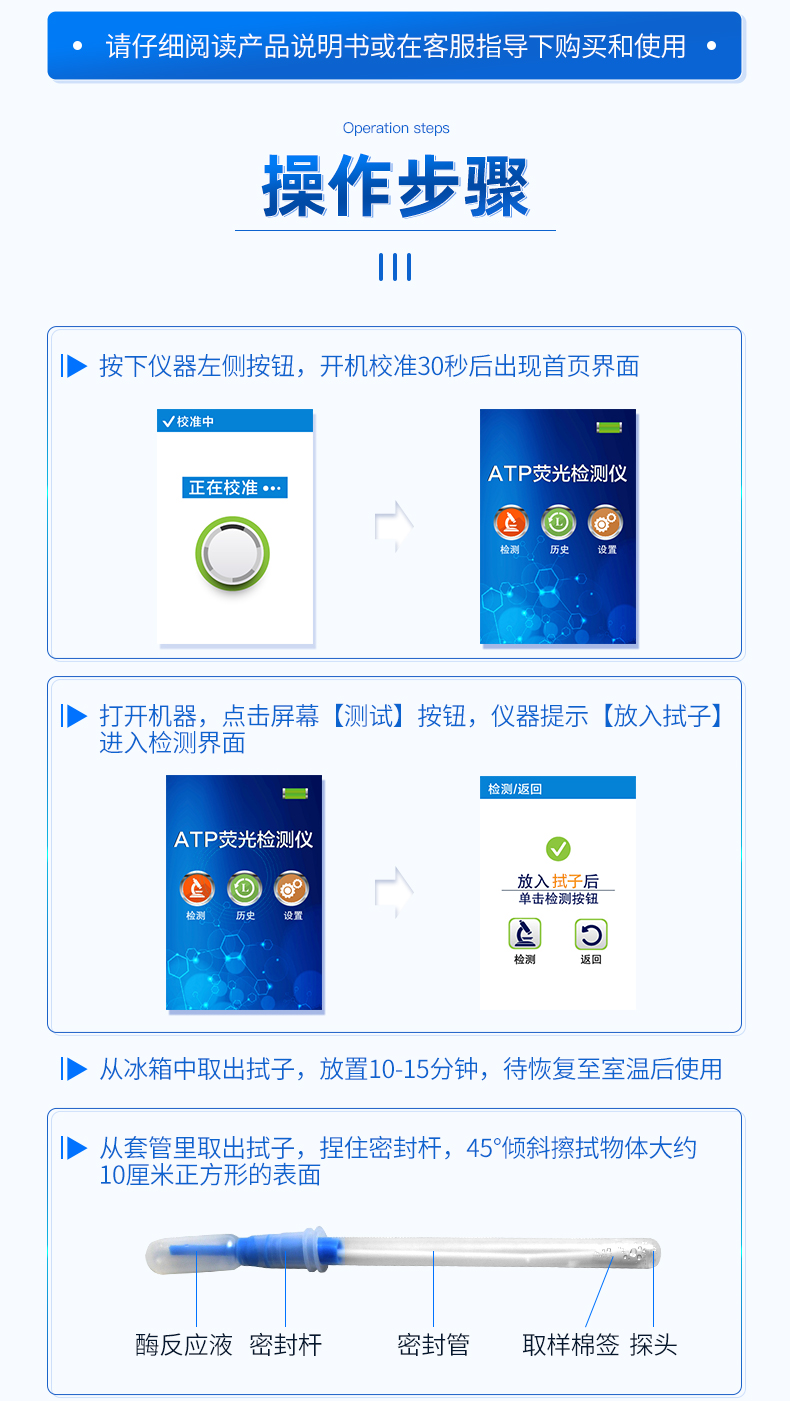 該設(shè)備為全新升級產(chǎn)品,大屏幕觸摸顯示屏,代替?zhèn)鹘y(tǒng)按鍵。操作采用生物化學(xué)反應(yīng)方法檢測ATP含量,ATP熒光檢測儀基于螢火蟲發(fā)光原理,利用“熒光素酶—熒光素體系”快速檢測三磷酸腺苷(ATP)。ATP拭子含有可以裂解細(xì)胞膜的試劑,能將細(xì)胞內(nèi)ATP釋放出來,與試劑中含有的特異性酶發(fā)生反應(yīng),產(chǎn)生光,再用熒光照度計(jì)檢測發(fā)光值,微生物的數(shù)量與發(fā)光值成正比,由于所有生物活細(xì)胞中含有恒量的ATP,所以ATP含量可以清晰地表明樣品中微生物與其他生物殘余的多少,用于判斷衛(wèi)生狀況。