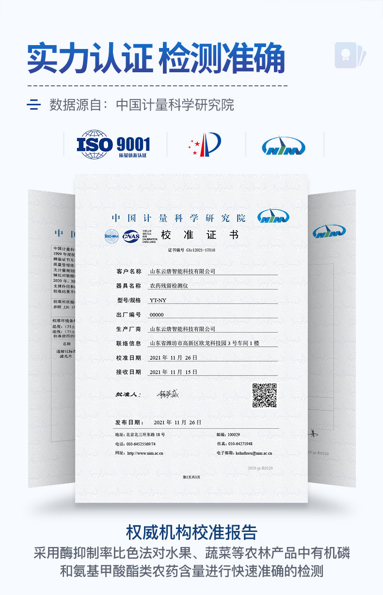 檢測(cè)標(biāo)準(zhǔn):依據(jù)國(guó)家標(biāo)準(zhǔn)方法(GB/T5009.199-2003)以及世界衛(wèi)生組織WHO、世界糧農(nóng)組織FAO殘留農(nóng)藥檢測(cè)標(biāo)準(zhǔn)、世界環(huán)境保護(hù)局EPA參照攝入量等要求來(lái)設(shè)計(jì)。采用酶抑制率比色法對(duì)水果、蔬菜等農(nóng)林產(chǎn)品中有機(jī)磷和氨基甲酸酯類(lèi)農(nóng)藥含量進(jìn)行快速準(zhǔn)確的檢測(cè)。