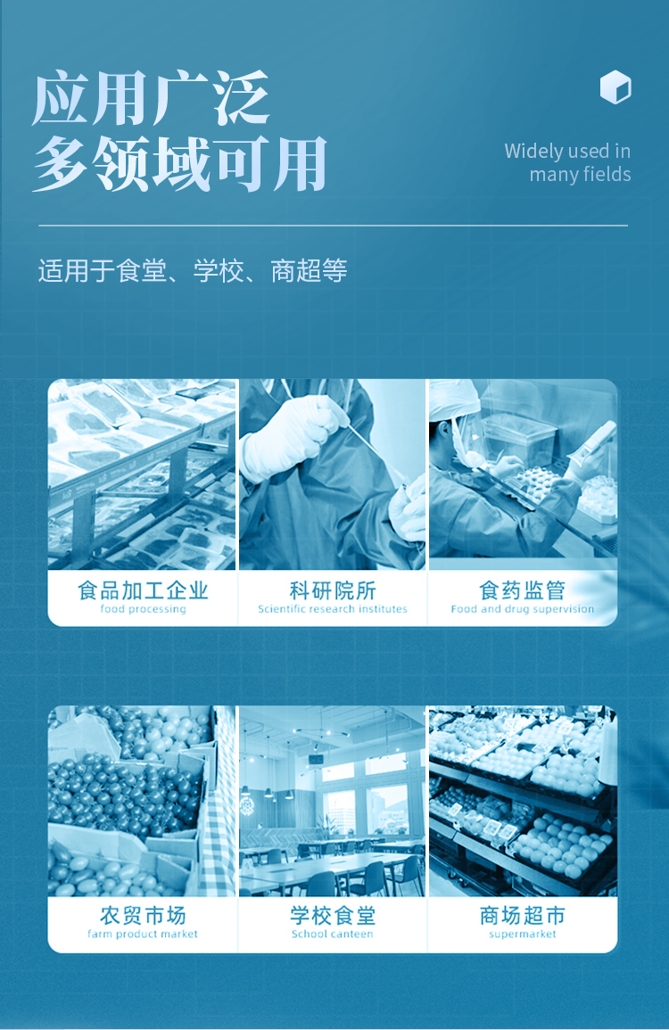 山東云唐智能科技有限公司生產(chǎn)的農(nóng)藥殘留檢測儀廣泛應用于主要用于蔬菜、水果、茶葉、糧食、農(nóng)副產(chǎn)品等食品中農(nóng)藥殘留的快速檢測,依據(jù)國標GB/T5009.199-2003進行檢測,適用于果蔬茶生產(chǎn)基地以及農(nóng)貿(mào)批發(fā)銷售市場現(xiàn)場檢測,餐館、學校、食堂、家庭果蔬加工前的安全速測等。