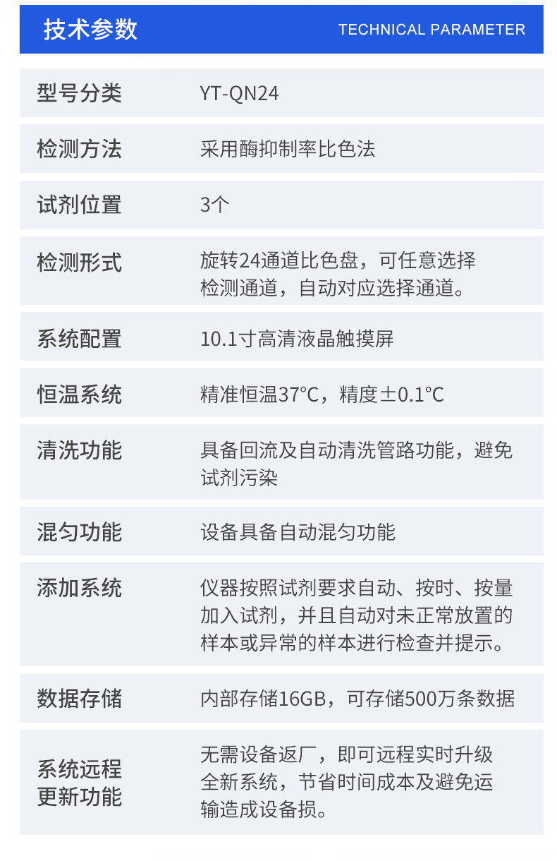 | 1. 試劑位置:3個 | 2. 檢測形式:旋轉(zhuǎn)24通道比色盤,可任意選擇檢測通道,自動對應(yīng)選擇通道。 | 3. 系統(tǒng)配置:10.1寸高清液晶觸摸屏,采用ARM Cortex?-A7,RK3288/4核處理器,運(yùn)行內(nèi)存1GB。Android7.1.1 系統(tǒng)分辨率1280×800。 | 4.恒溫系統(tǒng):具有自動加溫溫控系統(tǒng),精準(zhǔn)恒溫37℃,精度±0.1℃。 | 5.添加系統(tǒng):儀器按照試劑要求自動、按時、按量加入試劑,并且自動對未正常放置的樣本或異常的樣本進(jìn)行檢查并提示。 | 6.清洗功能:儀器具備回流及自動清洗管路功能,避免試劑污染。 | 7.混勻功能:設(shè)備具備自動混勻功能。 | 8.光源校準(zhǔn):設(shè)備可自動校準(zhǔn),確保檢測準(zhǔn)確度。 | 9.實時監(jiān)控:儀器測試過程中屏幕顯示運(yùn)行狀態(tài),可實時查看。 | 10.數(shù)據(jù)存儲:內(nèi)部存儲16GB,可存儲500萬條數(shù)據(jù)。 | 11.樣品多選功能:設(shè)備具備樣品一鍵多選功能,選擇樣品自動匹配檢測通道。 | 12.項目預(yù)設(shè):可提前設(shè)置單個及多個相同或不相同的檢測任務(wù),可單次或者多次調(diào)取,減少檢測時間。 | 13.自定義打印系統(tǒng):內(nèi)置自定義打印系統(tǒng),可按需靈活設(shè)置開啟或關(guān)閉:產(chǎn)品合格證(國家農(nóng)業(yè)部標(biāo)準(zhǔn)),二維碼,抽樣信息、檢測信息,受檢信息等信息的打印。 | 14.A4版本報告打印功能:設(shè)備可自動生成A4版報告,A4報告帶二維碼,可掃描二維碼生成電子版,并可識別真?zhèn)巍?/td> | 15.傳輸方式:儀器配備無線通信模塊: 4G(APN)通訊模塊、Wifi模塊,藍(lán)牙傳輸模塊,同時具有USB接口以及RJ45接口能以多種方式實現(xiàn)數(shù)據(jù)保存和數(shù)據(jù)傳輸功能,設(shè)備數(shù)據(jù)可以同步上傳至平臺。 | 16.數(shù)據(jù)監(jiān)管系統(tǒng):設(shè)備自帶監(jiān)管平臺,并可同步對接監(jiān)管平臺,數(shù)據(jù)可局域網(wǎng)和互聯(lián)網(wǎng)數(shù)據(jù)上傳,檢測結(jié)果可直接傳至食品安全監(jiān)管平臺。達(dá)到食品安全問題預(yù)估、預(yù)警。 | 17.系統(tǒng)遠(yuǎn)程更新功能:無需設(shè)備返廠,即可遠(yuǎn)程實時升級全新系統(tǒng),節(jié)省時間成本及避免運(yùn)輸造成設(shè)備損。 |