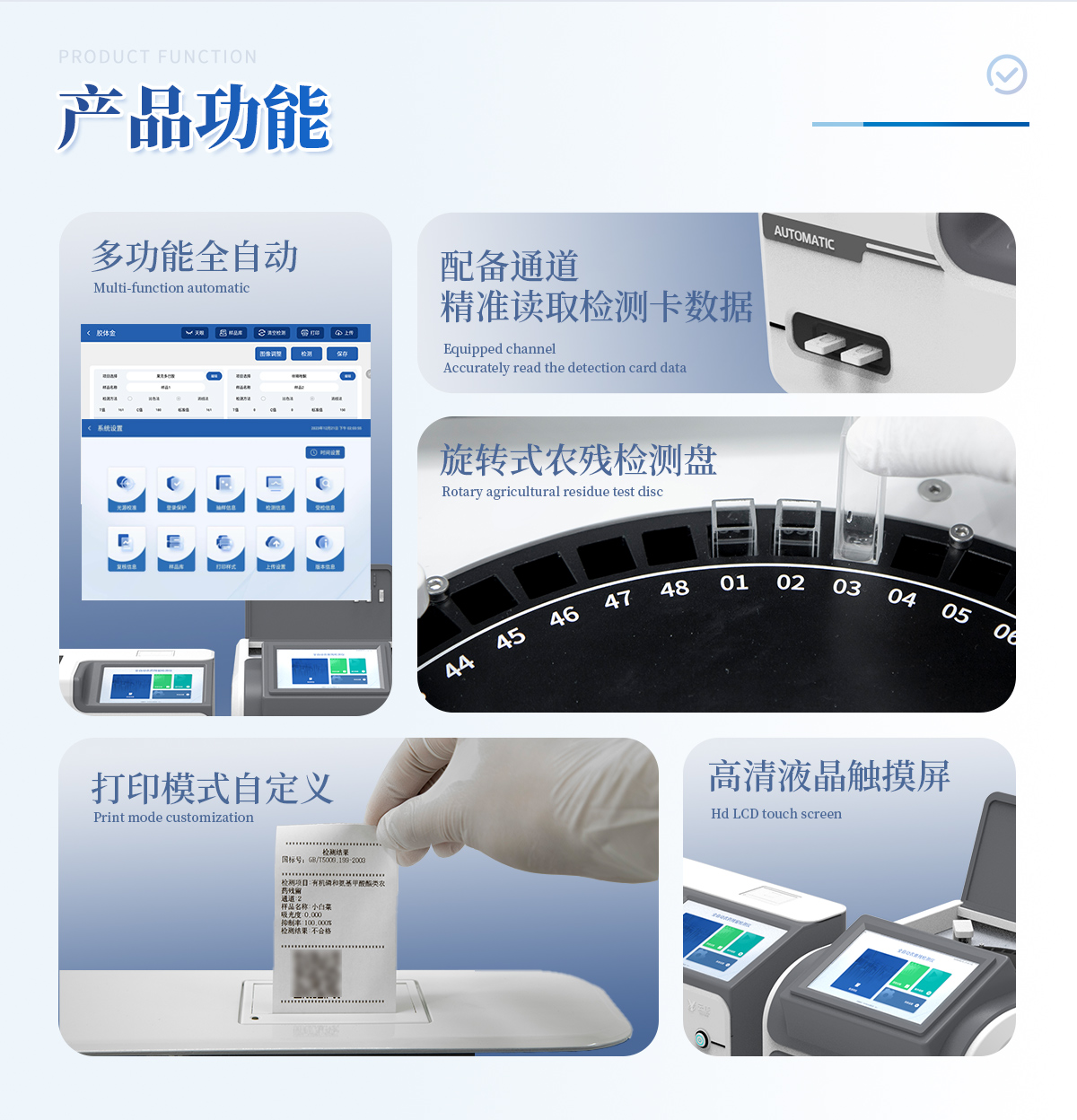 | 1. 試劑位置:3個(gè) | 2. 農(nóng)殘檢測(cè)盤:旋轉(zhuǎn)24通道比色盤,可任意選擇檢測(cè)通道,自動(dòng)對(duì)應(yīng)選擇通道。 | 3. 膠體金通道:2個(gè),可讀取檢測(cè)卡結(jié)果,自動(dòng)采集、處理分析,自動(dòng)判斷檢測(cè)結(jié)果,并具備自動(dòng)判空功能。 | 4.系統(tǒng)配置:10.1寸高清液晶觸摸屏,采用ARM Cortex?-A7,RK3288/4核處理器,運(yùn)行內(nèi)存1GB。Android7.1.1 系統(tǒng)分辨率1280×800。 | 5.恒溫系統(tǒng):具有自動(dòng)加溫溫控系統(tǒng),精準(zhǔn)恒溫37℃,精度±0.1℃。 | 6.添加系統(tǒng):儀器按照試劑要求自動(dòng)、按時(shí)、按量加入試劑,并且自動(dòng)對(duì)未正常放置的樣本或異常的樣本進(jìn)行檢查并提示。 | 7.清洗功能:儀器具備回流及自動(dòng)清洗管路功能,避免試劑污染。 | 8.混勻功能:設(shè)備具備自動(dòng)混勻功能。 | 9.光源校準(zhǔn):設(shè)備可自動(dòng)校準(zhǔn),確保檢測(cè)準(zhǔn)確度。 | 10.實(shí)時(shí)監(jiān)控:儀器測(cè)試過(guò)程中屏幕顯示運(yùn)行狀態(tài),可實(shí)時(shí)查看。 | 11.數(shù)據(jù)存儲(chǔ):內(nèi)部存儲(chǔ)16GB,可存儲(chǔ)500萬(wàn)條數(shù)據(jù)。 | 12.樣品多選功能:設(shè)備具備樣品一鍵多選功能,選擇樣品自動(dòng)匹配檢測(cè)通道。 | 13.項(xiàng)目預(yù)設(shè):可提前設(shè)置單個(gè)及多個(gè)相同或不相同的檢測(cè)任務(wù),可單次或者多次調(diào)取,減少檢測(cè)時(shí)間。 | 14.自定義打印系統(tǒng):內(nèi)置自定義打印系統(tǒng),可按需靈活設(shè)置開啟或關(guān)閉:產(chǎn)品合格證(國(guó)家農(nóng)業(yè)部標(biāo)準(zhǔn)),二維碼,抽樣信息、檢測(cè)信息,受檢信息等信息的打印。 | 15.A4版本報(bào)告打印功能:設(shè)備可自動(dòng)生成A4版報(bào)告,A4報(bào)告帶二維碼,可掃描二維碼生成電子版,并可識(shí)別真?zhèn)巍?/td> | 16.傳輸方式:儀器配備無(wú)線通信模塊: 4G(APN)通訊模塊、Wifi模塊,藍(lán)牙傳輸模塊,同時(shí)具有USB接口以及RJ45接口能以多種方式實(shí)現(xiàn)數(shù)據(jù)保存和數(shù)據(jù)傳輸功能,設(shè)備數(shù)據(jù)可以同步上傳至平臺(tái)。 | 17.系統(tǒng)17.數(shù)據(jù)監(jiān)管系統(tǒng):設(shè)備自帶監(jiān)管平臺(tái),并可同步對(duì)接監(jiān)管平臺(tái),數(shù)據(jù)可局域網(wǎng)和互聯(lián)網(wǎng)數(shù)據(jù)上傳,檢測(cè)結(jié)果可直接傳至食品安全監(jiān)管平臺(tái)。達(dá)到食品安全問(wèn)題預(yù)估、預(yù)警。 | 18.系統(tǒng)遠(yuǎn)程更新功能:無(wú)需設(shè)備返廠,即可遠(yuǎn)程實(shí)時(shí)升級(jí)全新系統(tǒng),節(jié)省時(shí)間成本及避免運(yùn)輸造成設(shè)備損。 |