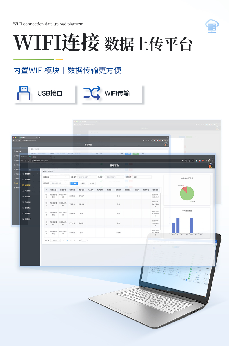 8.3、數(shù)據(jù)監(jiān)管系統(tǒng):同步對(duì)接監(jiān)管平臺(tái),數(shù)據(jù)可局域網(wǎng)和互聯(lián)網(wǎng)數(shù)據(jù)上傳,檢測(cè)結(jié)果可選擇直接傳至食品安全監(jiān)管平臺(tái)。進(jìn)行區(qū)域食品安全監(jiān)管及大數(shù)據(jù)分析處理與數(shù)據(jù)統(tǒng)計(jì),檢測(cè)區(qū)域食品安全長(zhǎng)短期動(dòng)態(tài),達(dá)到食品安全問題預(yù)估、預(yù)警。