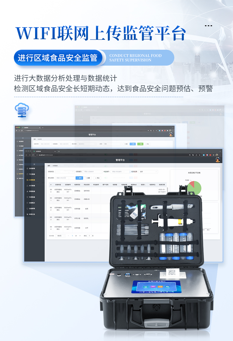 4、儀器帶有監(jiān)管平臺。數(shù)據(jù)可局域網(wǎng)和互聯(lián)網(wǎng)數(shù)據(jù)上傳,檢測結(jié)果直接傳至食品安全監(jiān)管平臺。進(jìn)行區(qū)域食品安全監(jiān)管及大數(shù)據(jù)分析處理與數(shù)據(jù)統(tǒng)計(jì),檢測區(qū)域食品安全長短期動(dòng)態(tài),達(dá)到食品安全問題預(yù)估、預(yù)警。